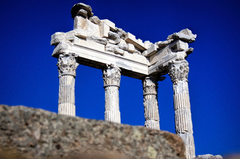 Akropol’ün bir başka tapınağı olan Dionysos Tapınağı, tiyatro terasının kuzeyindeydi. 25 basamakla çıkılan bir podyum üzerinde bulunan tapınağın yalnız ön yüzünde sütunlar vardı.